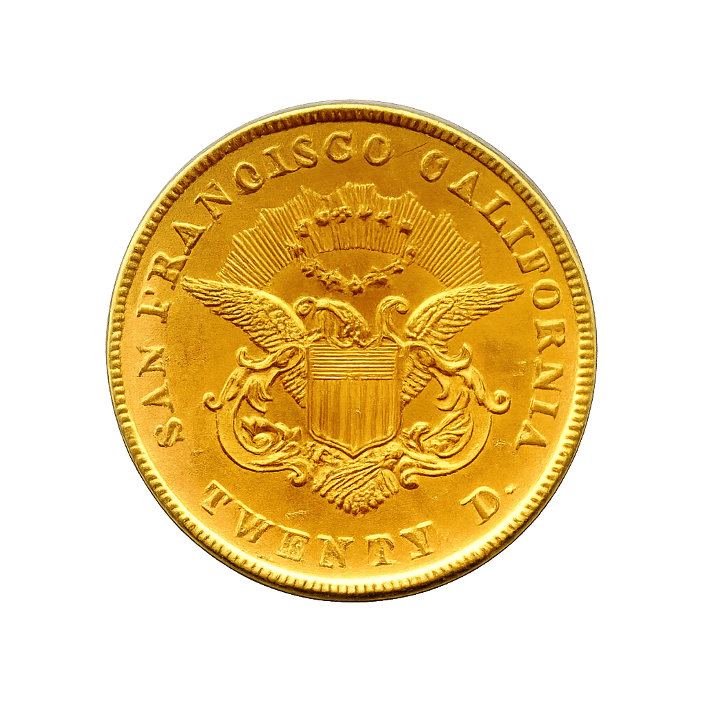 The reverse of the 1854 Kellogg & co. $20 Coin features a bold eagle motif, symbolizing strength and national pride during the California Gold Rush era. Struck by Kellogg & Co. in locally sourced gold, the design is crisply rendered with intricate detailing in the feathers and shield elements, showcasing the high-quality craftsmanship of mid-19th century private minting. Each coin carries a face value of $20 and reflects the practical yet artistic approach of private mints supplying reliable coinage in a rapidly growing economy. The simplicity and clarity of the eagle design make it both historically significant and highly collectible, appealing to numismatists and history enthusiasts alike.
